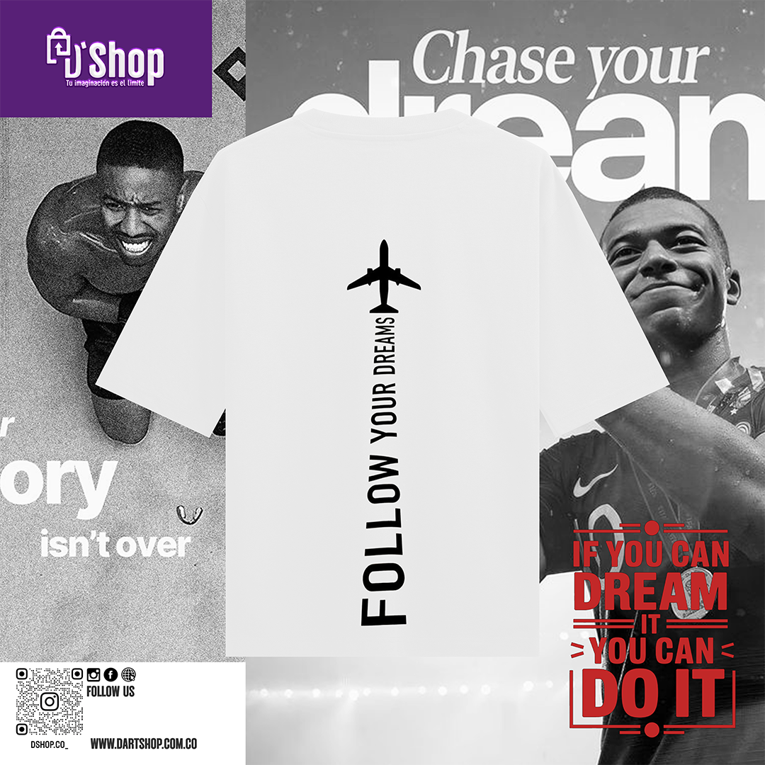 Presentamos la camiseta FOLLOW YOUR DREAM , una prenda diseñada para inspirar y motivar a quienes se atreven a perseguir sus aspiraciones más audaces. Esta camiseta no es solo una pieza de vestimenta, sino una declaración de intenciones, un recordatorio constante de que el camino hacia el éxito comienza con un sueño y la determinación de hacerlo realidad.