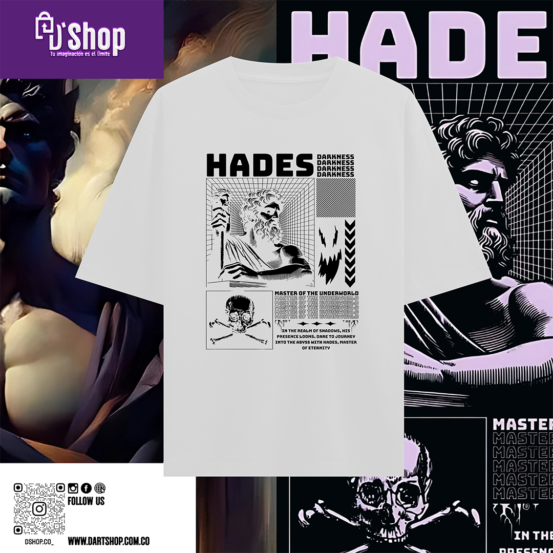 La camiseta HADESTM es ideal para quienes buscan destacar y llevar consigo un pedazo de mitología y arte contemporáneo. Es una invitación a explorar los límites de la imaginación y a abrazar la fuerza interior.