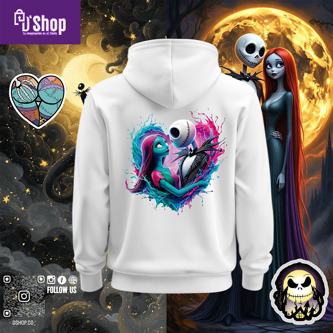 Presentamos la sudadera con capucha JACKYSALLY, una prenda que fusiona el encanto gótico con un diseño vibrante y lleno de personalidad. Esta sudadera blanca, confeccionada con materiales de alta calidad, se convierte en el lienzo perfecto para una obra de arte que celebra el amor en su forma más peculiar y cautivadora.