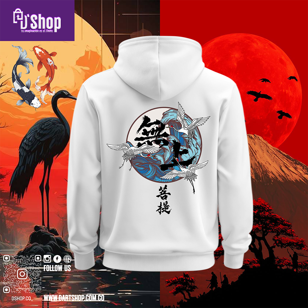 El fondo de la imagen del producto complementa la estética de la sudadera, presentando elementos icónicos que refuerzan la temática japonesa. A la izquierda, un majestuoso grulla negra se alza sobre rocas, mientras que dos peces koi, uno blanco y negro y otro naranja vibrante, nadan en aguas tranquilas, simbolizando la perseverancia y la prosperidad. A la derecha, una imponente luna roja se cierne sobre un paisaje montañoso que recuerda al Monte Fuji, con siluetas de árboles de arce de un rojo intenso que añaden dramatismo. Las siluetas de guerreros en la parte inferior sugieren un eco del pasado samurái, aportando una sensación de historia y tradición.