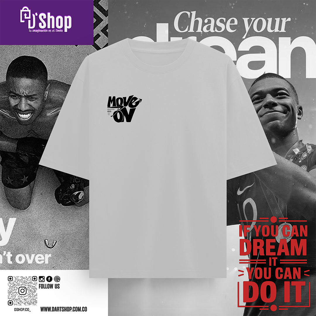 MOVE ON se inspira en la mentalidad de superación y el impulso constante hacia adelante. El gráfico central, con su tipografía audaz y dinámica, transmite un mensaje de perseverancia y determinación. Es una declaración de intenciones, un recordatorio visual para no detenerse ante los obstáculos y seguir persiguiendo tus metas.
