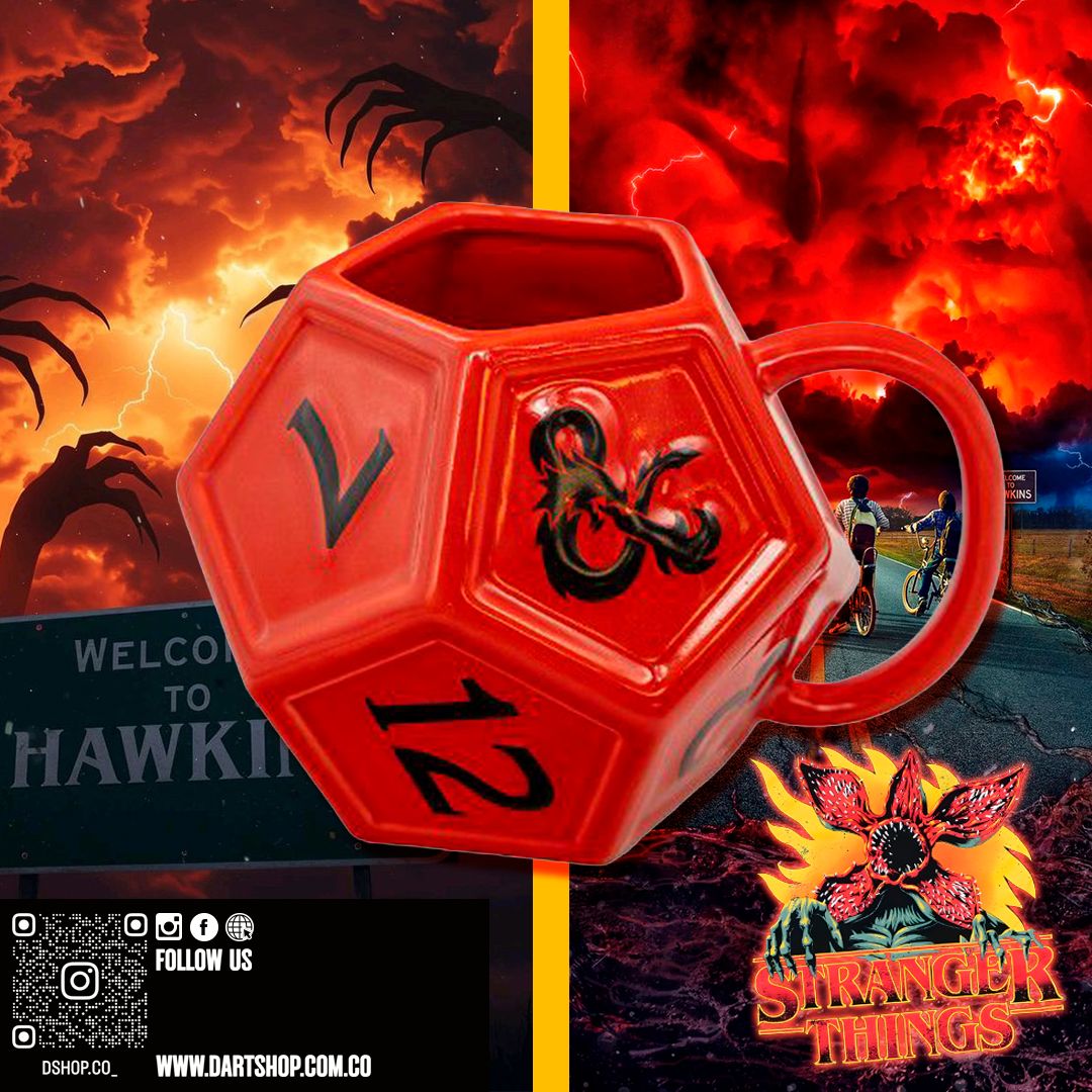 Esta taza única captura la esencia del Upside Down y el mundo de Hawkins, con detalles inspirados en Dungeons & Dragons.