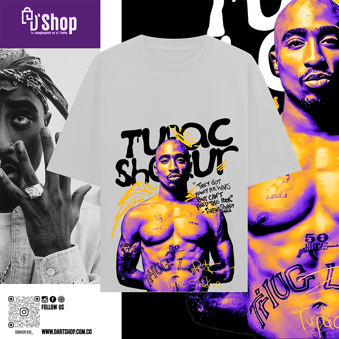 El diseño central de la camiseta presenta una impactante imagen de Tupac Shakur, con su mirada penetrante y su físico esculpido, adornado con tatuajes icónicos que cuentan su historia. La paleta de colores vibrantes, que combina morados intensos y amarillos eléctricos, resalta la energía y la pasión que caracterizaban a Tupac, creando un efecto visual que no pasará desapercibido. Las inscripciones en el diseño, incluyendo la icónica frase “They got money for wars, but can’t feed the poor”, refuerzan el mensaje social y la conciencia que Tupac siempre defendió.